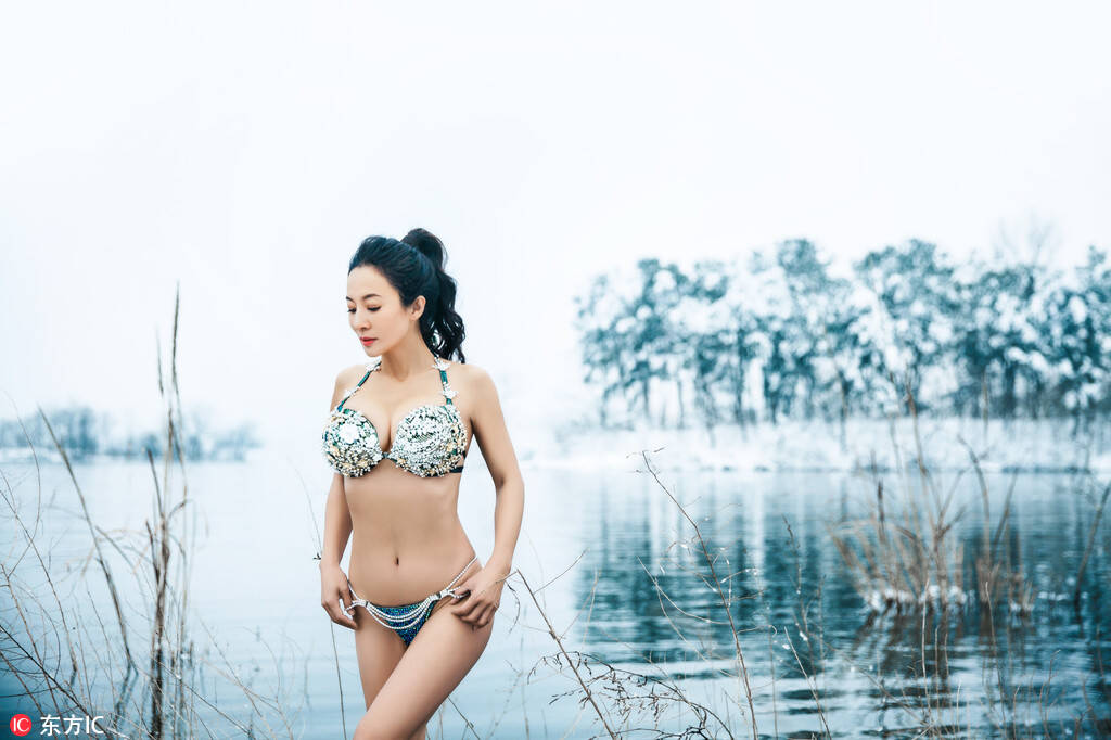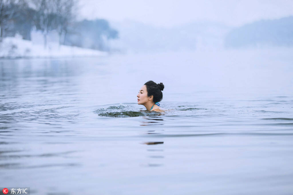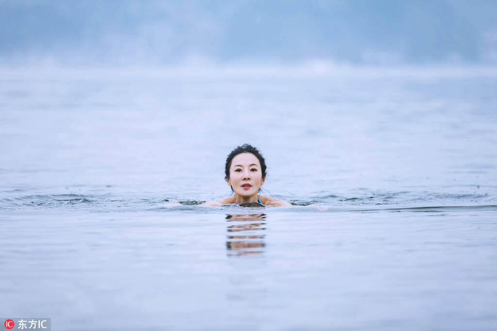2018年1月5日,河南信阳市遭遇大暴雪天,河南50岁冻龄女神刘叶琳在寒冬中冬游。